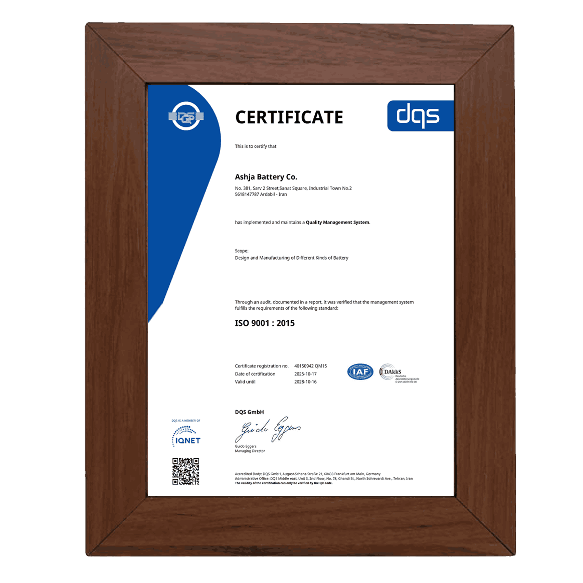 ایـن شـرکت طی سـال هاي فعالیـت خود همواره با شعار "مـا متعهدیم" نسـبت بـه آرمان هـاي کیفی و خدمـاتی خود متعهد بوده و سعی دارد گسـتــره ي خدمـات خود را به کوتاه ترین زمـان و نزدیک تریـن مـکان ارتقـاء دهــد آکو باتـري در راسـتاي تعـالی سـازمانی و اسـتقرار سیسـتم مدیریـت کیفیـت، حفظ محیـط زیست و کاهش آلاینده هـاي زیسـت محیـطی، ایمـنی و بهداشـت کارکنـان مجموعـه، توانسـته است اسـتاندارد و الــزامـات مرتبط با مـوارد ذکرشده را در این مجموعه مستقر نماید، لذا این مجموعه داراي گواهینامه هاي ذیل می باشد.